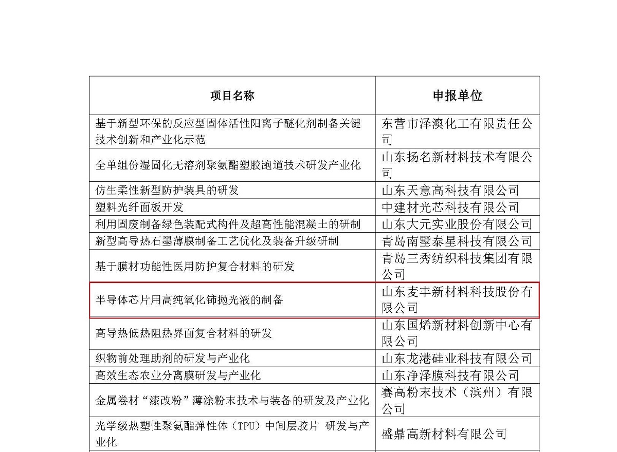 近日,山東省科學(xué)技術(shù)廳發(fā)布了《關(guān)于2021年山東省科技型中小企業(yè)創(chuàng)新能力提升工程擬立項(xiàng)項(xiàng)目公示的通知》,其中我司”半導(dǎo)體芯片用高純氧化鈰拋光液的制備“項(xiàng)目上榜!